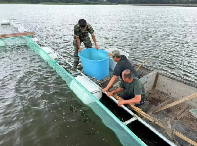 只见4个8米见方的网箱在波光粼粼的水面上格外显眼,技术员划着小船缓缓靠近,1000尾鳌鳇鱼苗正在水中欢快地摆尾,为这片水域增添了无限活力。据了解,这片面积达142公顷的水域曾经是闲置资源,如今却摇身一变,成了名副其实的“水下银行”。